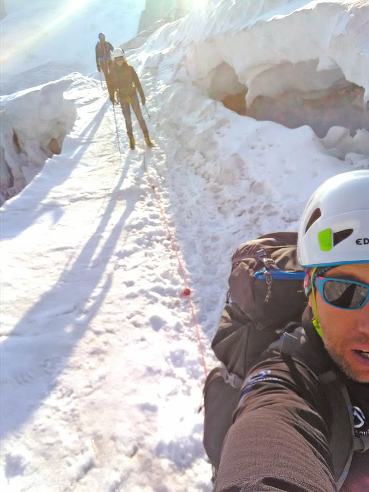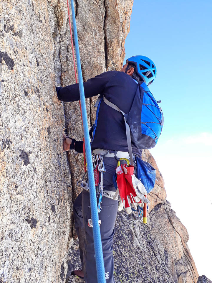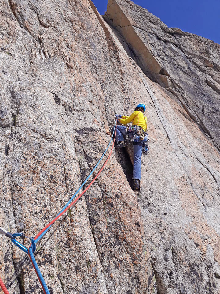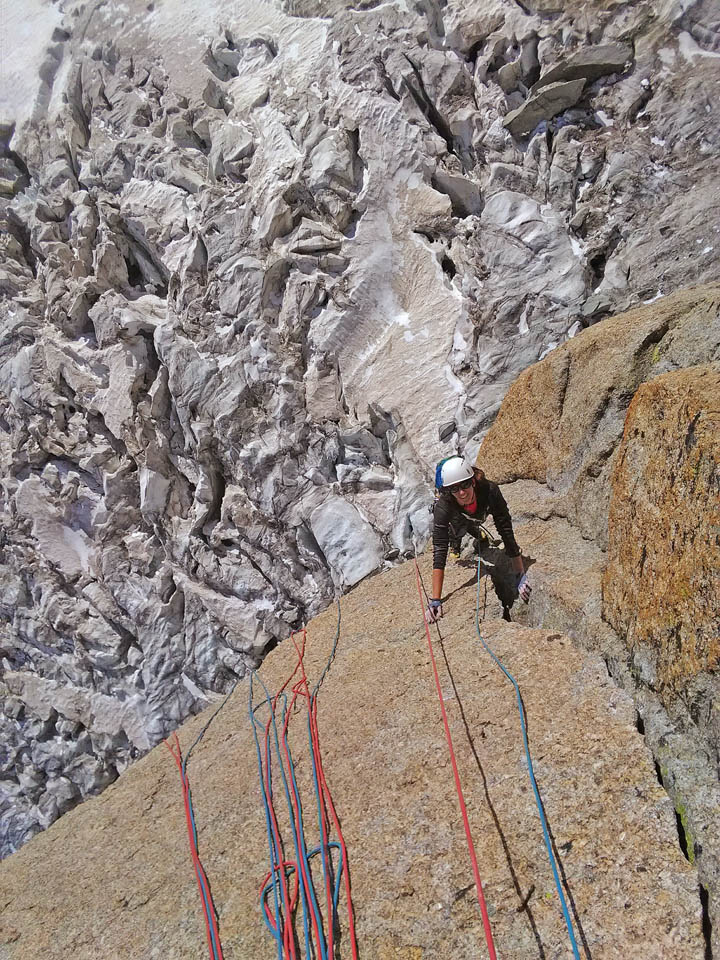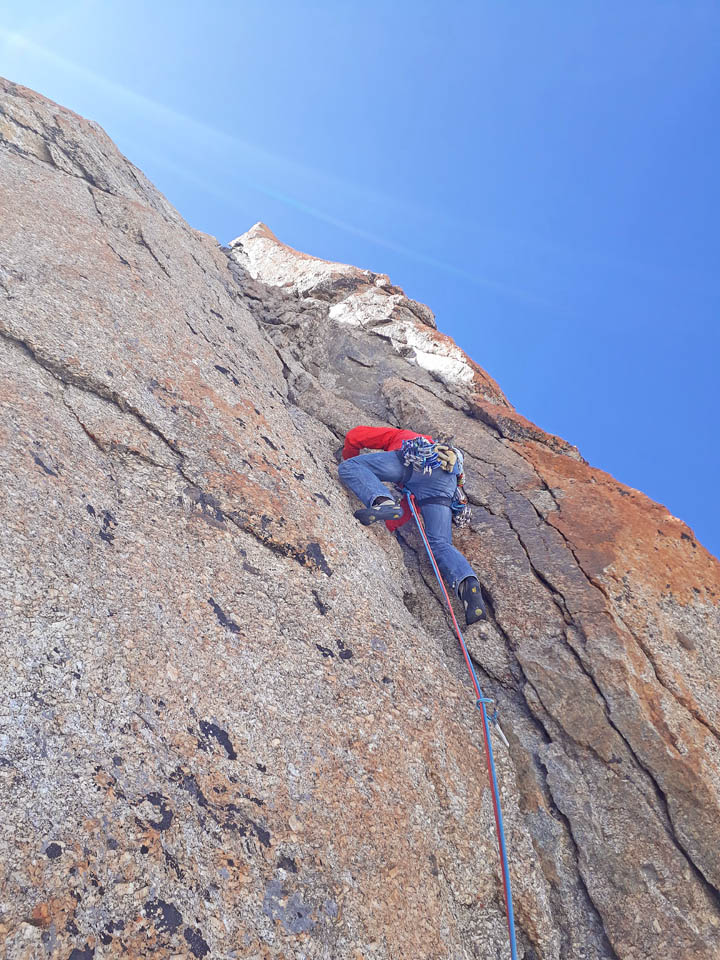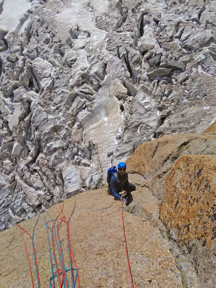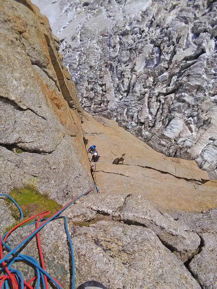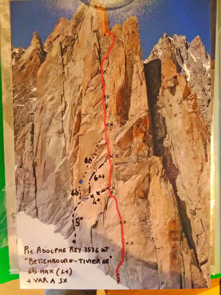 Due giorni di avventura, percorrendo il primo giorno l’Aiguille Marbrèe, tenendosi carichi per il giorno successivo con salita della Bettembourg a Pic Adolphe. Una linea davvero eccezionale, di quelle emozionanti ed impegnative, abbiamo percorso la variante di 6b di G. Bassanini, un po’ più facile della classica linea, ma davvero stupenda, forse, senza toglier nulla ai restanti tiri, la più bella! Fessure da togliere il fiato, continua e mai banale e una roccia strepitosa con super grip su dita e piedi!